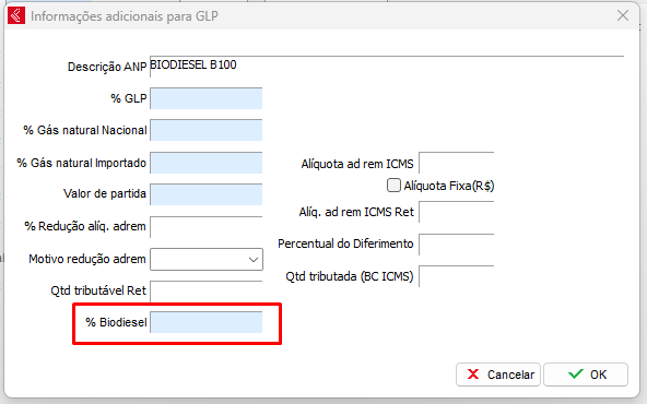Clicando no botão, apresentará a tela de Informações adicionais para GLP, nessa tela irá encontrar o campo % Biodisel.