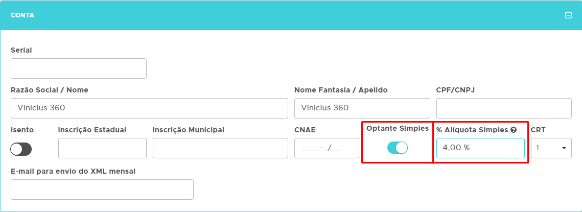 Ao acessar os Dados da Empresa, marque a opção Optante Simples e preencha a % Alíquota Simples, preencha este campo conforme orientação da sua contabilidade. Ao preencher clique em Atualizar para gravar os dados.