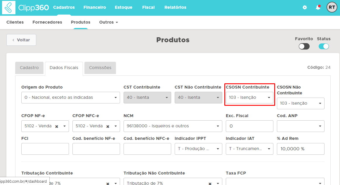 Possuindo a alíquota do mês cadastrada, acesse o cadastro do(s) produto(s) no estoque e configure o CSOSN Contribuinte.