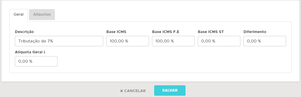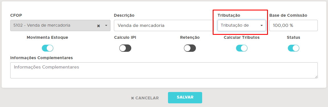 IMPORTANTE: caso o produto tenha o campo Tributação Contribuinte preenchido em seu cadastro, o sistema irá utilizar a taxa do produto e não do CFOP. Desta forma, se o item não possuir alguma Tributação Contribuinte selecionada, o sistema irá utilizar a taxa da Natureza de Operação (CFOP).