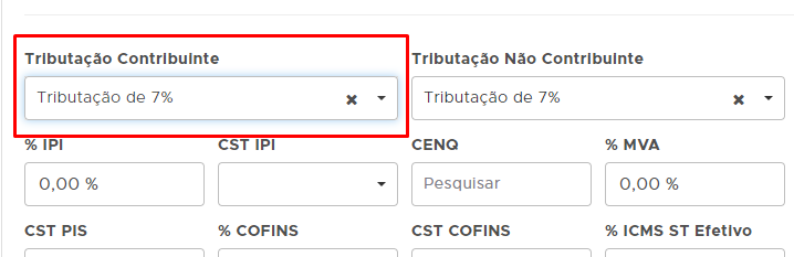 Ainda no cadastro do produto, verifique qual a Tributação Contribuinte que encontra-se selecionada. Caso não houver nenhuma Tributação Contribuinte preenchida, apenas salve o cadastro.