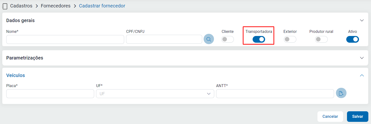 Ativando a opção Transportadora, o sistema habilitará a aba veículos, basta clicar na aba responsável e efetuar o cadastro.