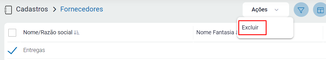 Para excluir um fornecedor cadastrado, selecione-o e na ação escolha Excluir.