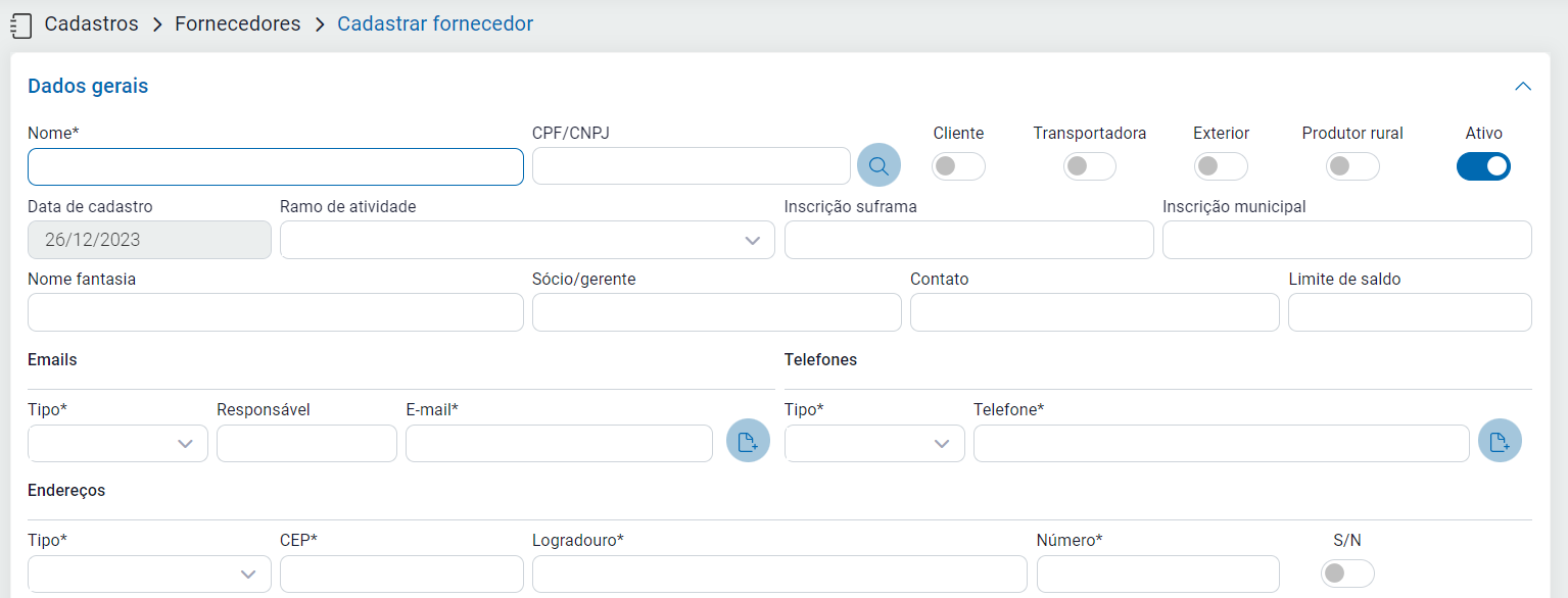 • Nome: Preencha o nome ou razão social do seu fornecedor;