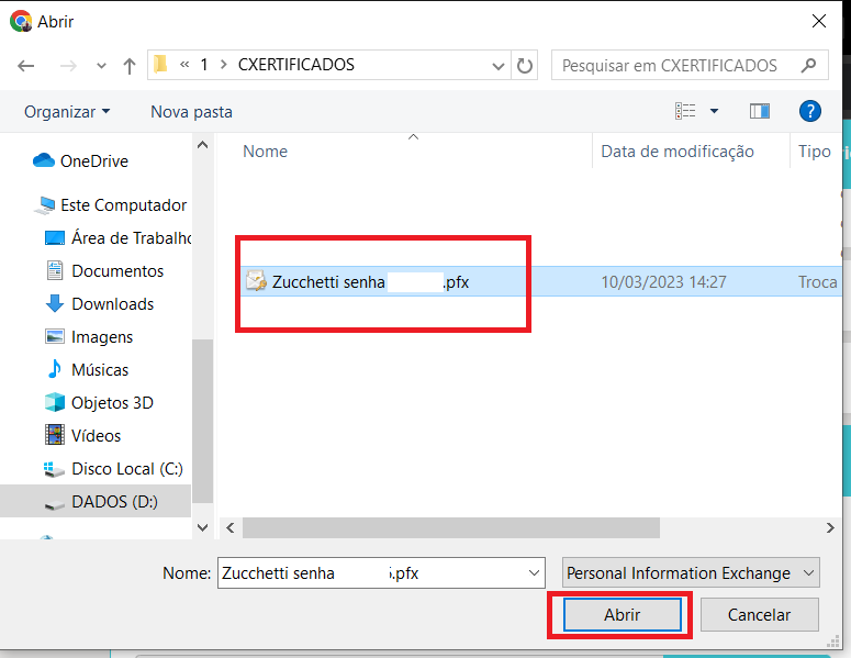 Escolha o local onde fica seu certificado e clique em abrir;