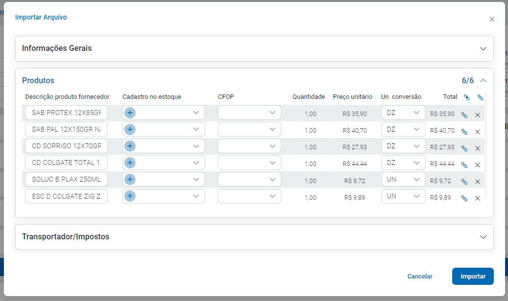 Será apresentado na tela o resumo da nota, observe a aba de produtos, caso queira alimentar a quantidade de um item já existente no seu estoque, aponte ele no campo Cadastro no estoque se deixar sem preencher o sistema vai cadastrar um item novo no estoque.