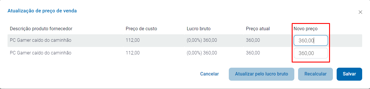 Caso o produto tiver a % do Lucro bruto preenchido é possível Atualizar pelo Lucro Bruto no qual é cadastrado no produto ou nas configurações da nota de compra, ou caso queira alterar o preço de cada um diferente do outro, será possível alterar no campo Novo Preço e então clique em Salvar.