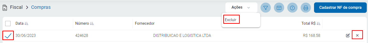 Caso queira cancelar o lançamento, marque a nota em questão e clique em Ação - Excluir; Ou clique no X no final da linha;