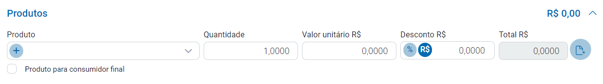 Na aba produtos são informados os itens que irão compor a nota, após preencher o produto, selecione a quantidade e o valor unitário.