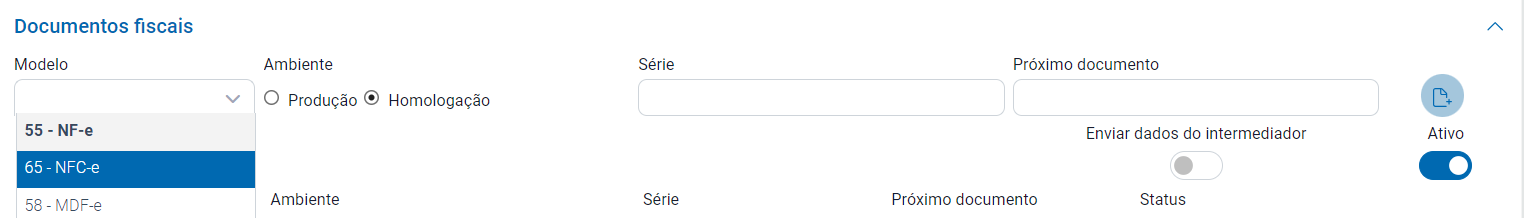 Selecione o modelo 65 - NFC-e para configurar a NFC-e: