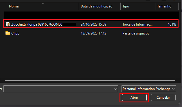 É necessário selecionar onde o certificado digital está salvo em seu micro, após localizar, clique sobre o mesmo e em seguida clique em Abrir.