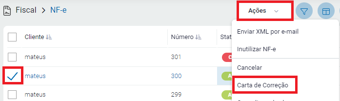 Agora, clique no botão Ações e escolha Carta de Correção.
