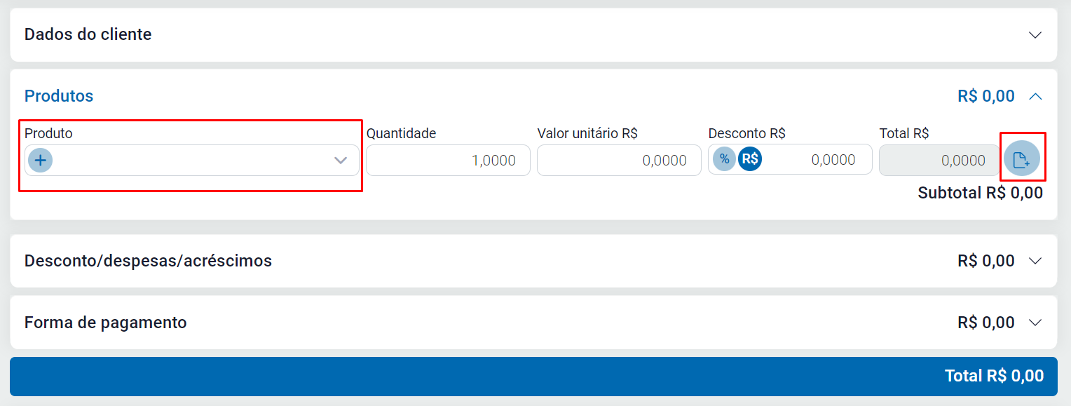 O primeiro passo é escolher o produto que deseja vender, poderá digitar a descrição, referência, código de barras ou o código do mesmo. Após escolher a mercadoria, quantidade e valor, clique no botão Adicionar (Destacado a direita).