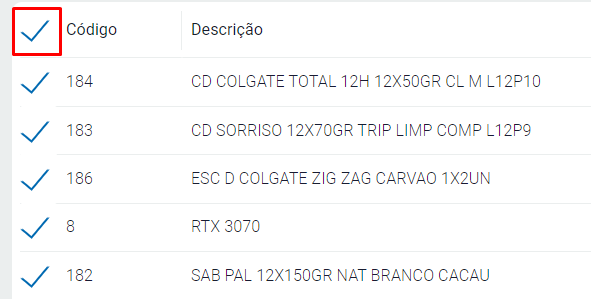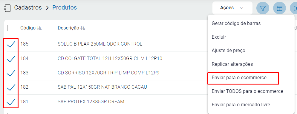 Caso queira, poderá marcar o checkbox para enviar todos os cadastros para o ecommerce, caso prefira enviar somente alguns, selecione-os individualmente.