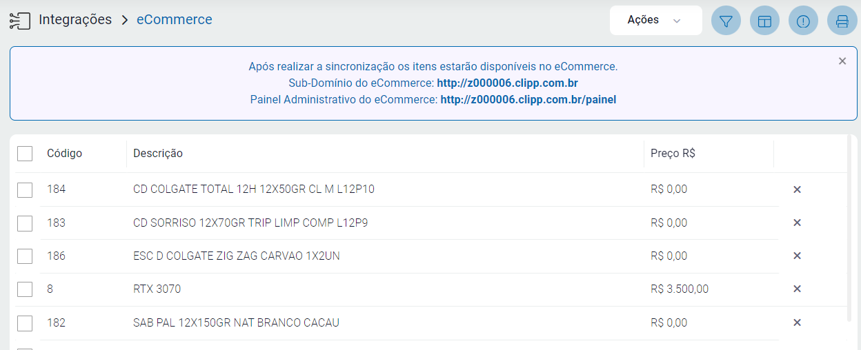 Clicando na aba Produtos é possível lançar os produtos enviados para o ECommerce, clicando no X irá inativar o item no site (caso acabe o estoque do mesmo, por exemplo).