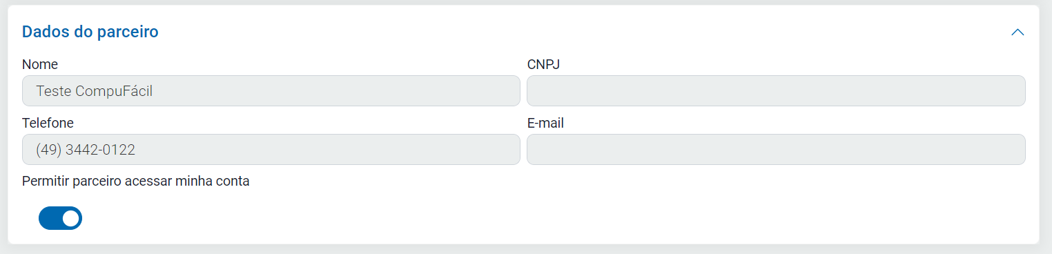 Nos dados do parceiro, é possível habilitar o acesso do parceiro a sua conta, para prestar suporte ou outras questões a serem alinhadas pela Revenda.