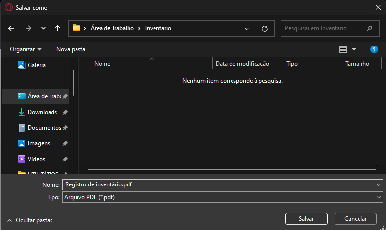 O Inventário será gerado em PDF em uma nova aba do navegador, clique com o botão direito na tela e escolha a opção Salvar Como;