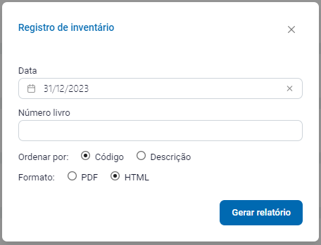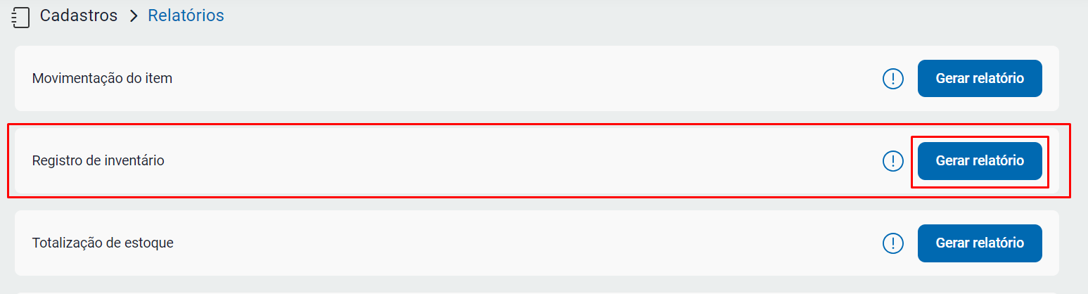 Em seguida, localize o Registro de Inventário e clique no botão Gerar Relatório;