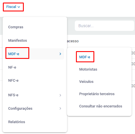 Para emitir o MDF-e, vá até Fiscal - MDF-e - MDF-e