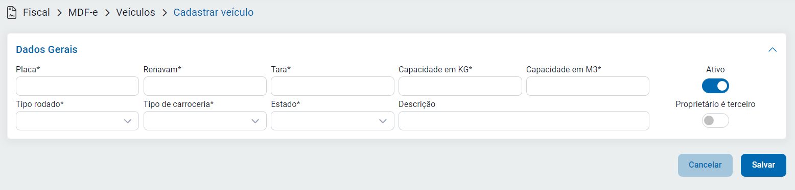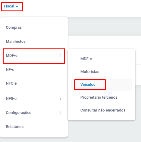 Para cadastrar os veículos, acesse Fiscal - MDF-e - Veículos;