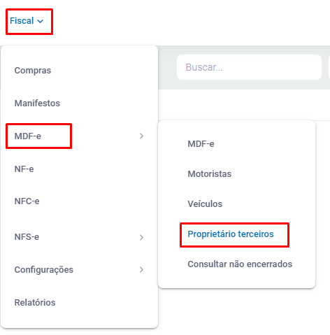 Para o Cadastro de Proprietários Terceiros vá até Fiscal - MDF-e - Proprietários Terceiros