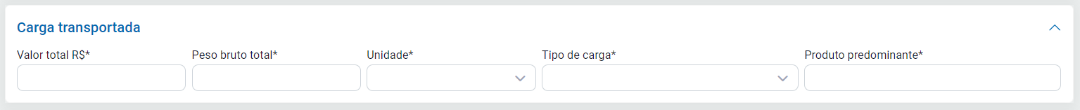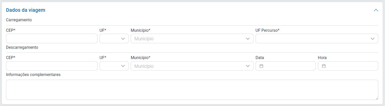 Nos Dados da Viagem, escolha a UF, município e CEP de carregamento, juntamente com a UF do percurso, no exemplo, consideramos que a mercadoria está saindo de SC e indo para MG, passando pelos estados do PR e SP;