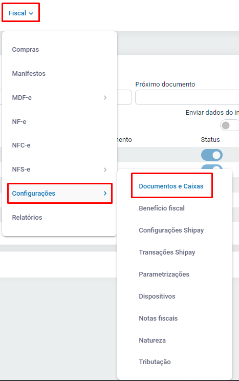 Para configurar, acesse Fiscal - Configurações - Documentos e Caixas