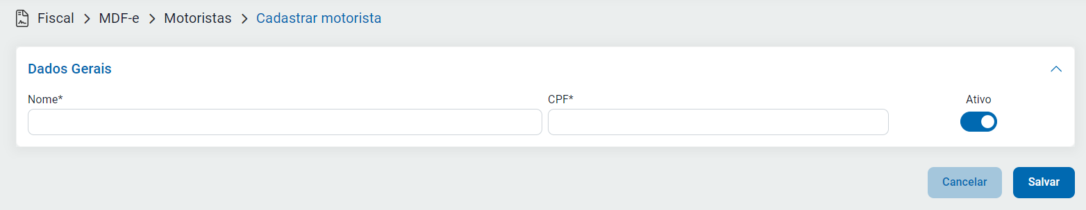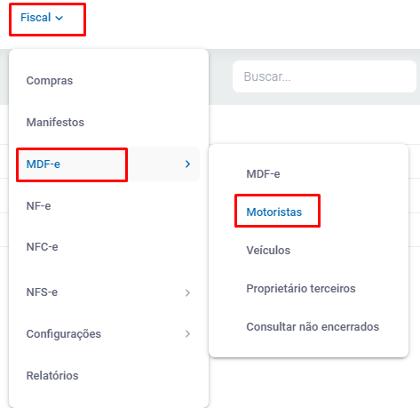Para realizar o cadastros dos motoristas, vá até Fiscal - MDF-e - Motoristas;