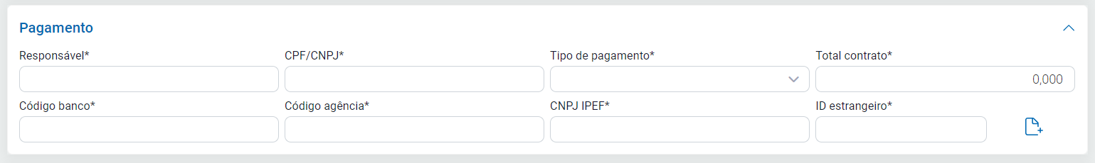 Na aba Pagamento, escolha o pagamento, os dados de código do banco, CNPJ IPEF (Instituição de Pagamento Eletrônico de Frete) e ID estrangeiro não são obrigatórios;