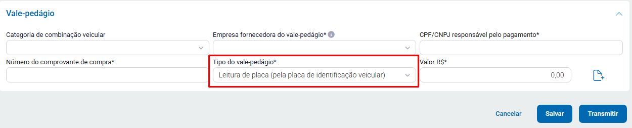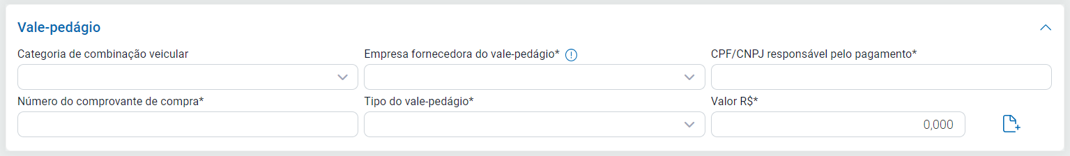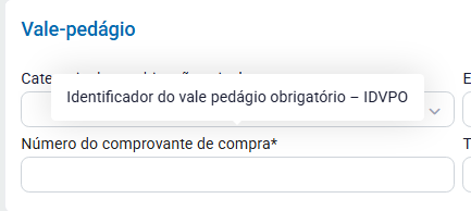 Adicionado - Caso levar o mouse até o campo “Número do comprovante de compra*” é apresentado a informação “Identificador do vale pedagio obrigatório – IDVPO.”