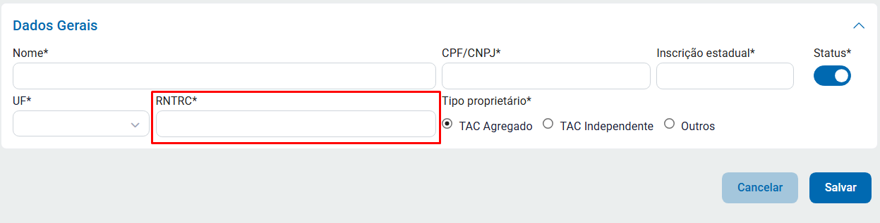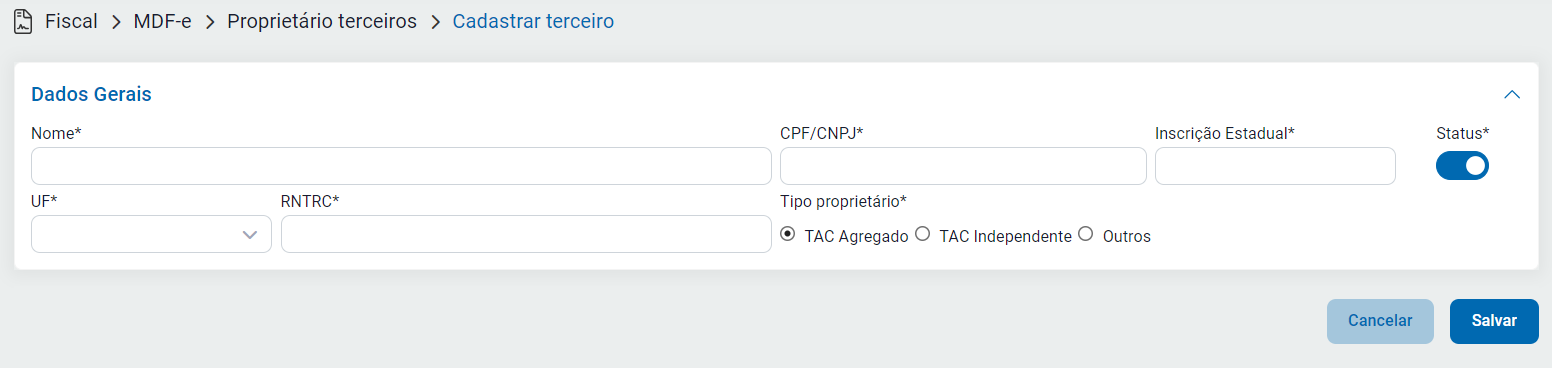 Para efetuar a geração é necessário o preenchimento do RNTRC, portanto para efetuar o preenchimento acesse Fiscal > MDF-e > Proprietário terceiro > Cadastrar terceiro.
