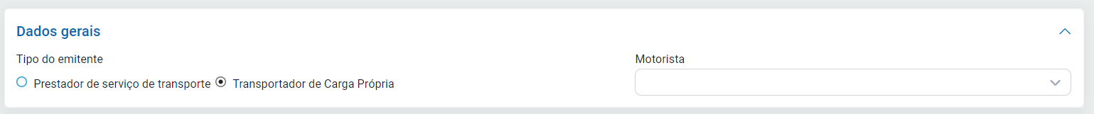 Nos Dados Gerais informe o tipo do emitente, prestador de serviço de transporte para quando você for transportar a mercadoria de alguém, transportador de carga própria, para quando for transportar a mercadoria da própria empresa;