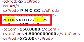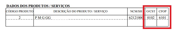 No exemplo acima, a nota foi recebida com o CSOSN 102 (indicado pela sigla o/cst), e com o CFOP 6101.