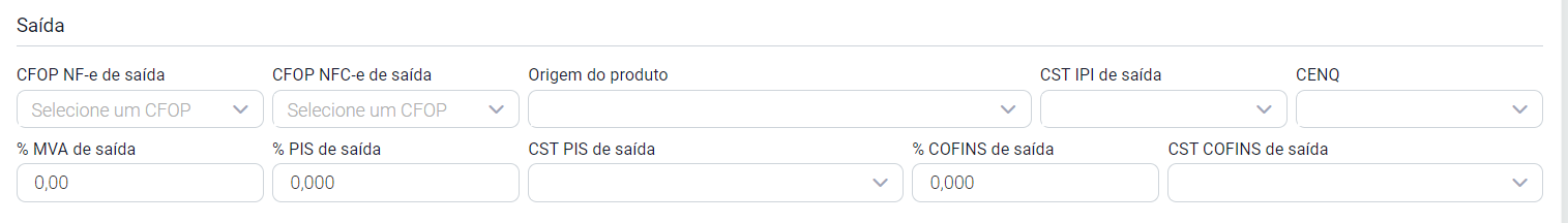 Nos Campos de saída você deverá configurar a tributação que será gravada no cadastro de estoque;