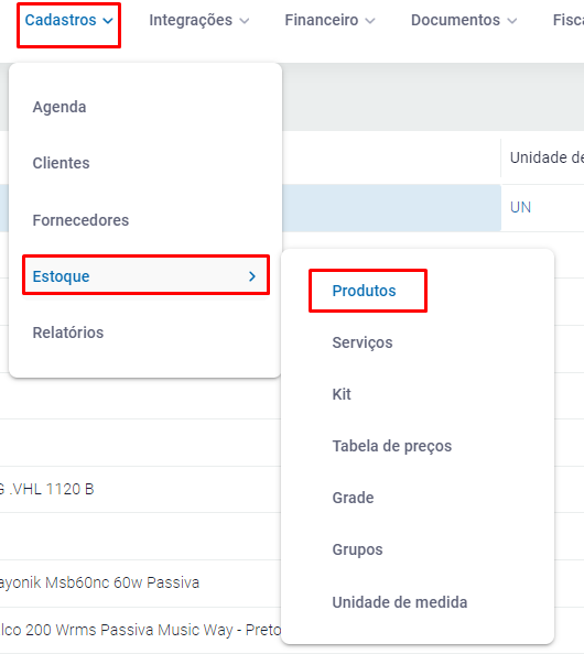 Para indicar esse perfil no item, vá até a aba Cadastros - Estoque - Produtos;