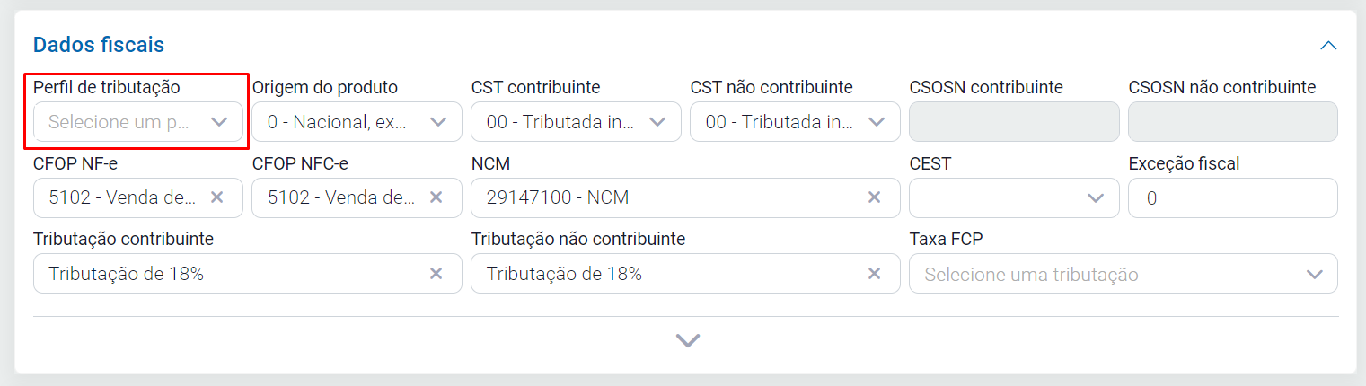 Com o cadastro do item aberto, vá até a aba Dados Fiscais e informe o Perfil no campo Perfil de tributação;