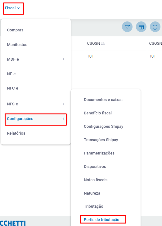Para cadastrar o Perfil de Tributação, vá até Fiscal - Configurações - Perfis de Tributação;