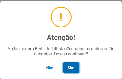 Quando selecionar o perfil, será apresentado na tela uma mensagem informado que os dados de cadastrados serão alterado para os dados informados no Perfil de Tributação.