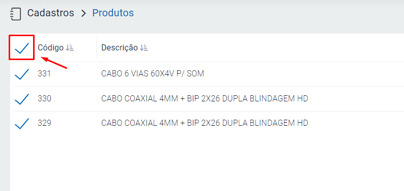 Faça um filtro no estoque e selecione todos os itens que deseja aplicar esse perfil clicando na caixinha a esquerda do código do item.