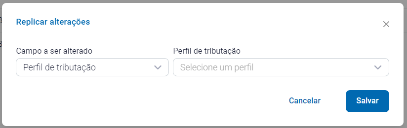 Será aberta a tela abaixo, na opção Campo a ser alterado selecione Perfil de Tributação e na opção Perfil de Tributação selecione o perfil que deseja aplicar para os itens selecionados.