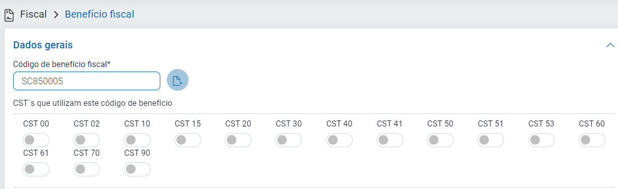 É necessário consultar a contabilidade, para saber cada CST e seu respectivo Código de Benefício. Assim que consultar será possível fazer o cadastro do Código de Benefício Fiscal acessando Fiscal - Configurações - Benefício Fiscal: