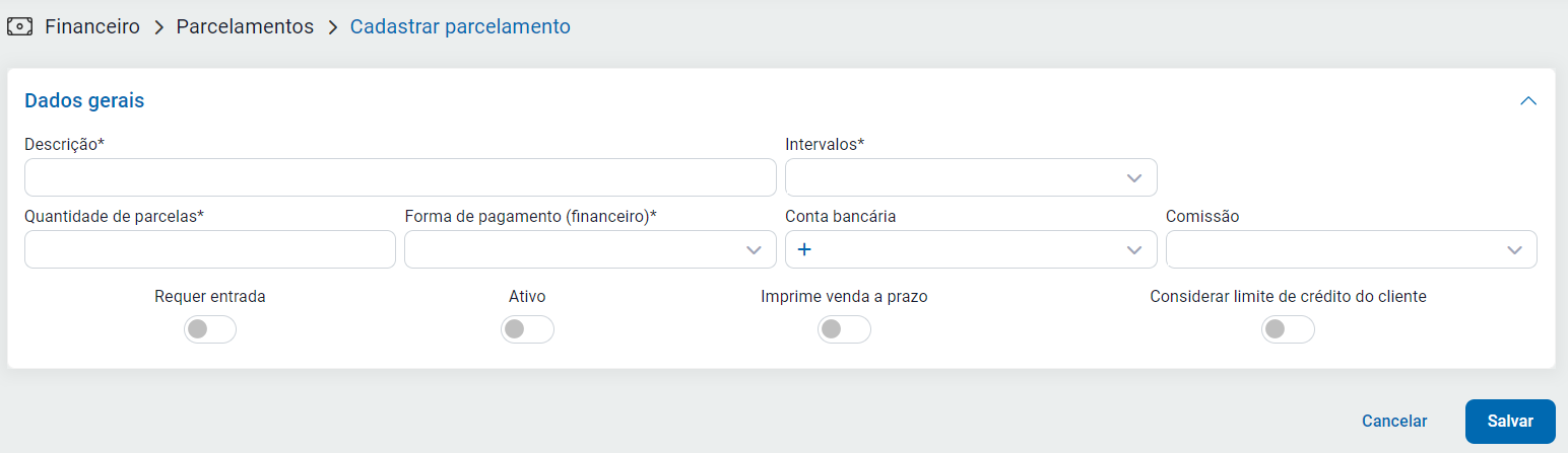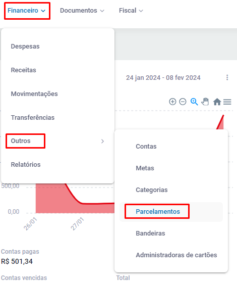 Para cadastrar a forma de pagamento, acesse Financeiro - Outros - Parcelamentos;