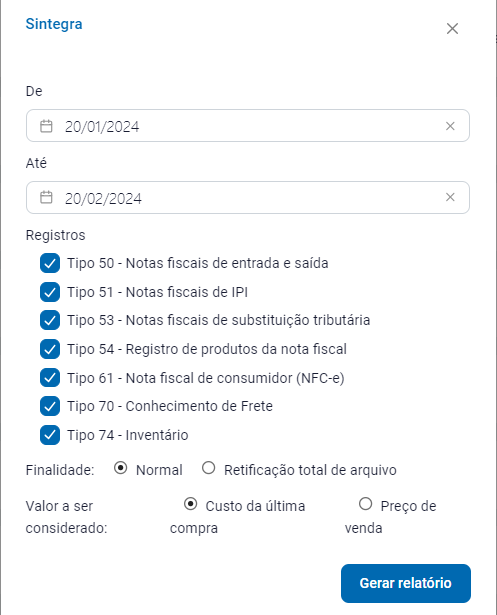 Defina o período que pretende gerar o arquivo, juntamente com os registros que deseja gerar e finalidade, (caso gere o 74 - Inventário, escolha o valor a ser considerado) em seguida clique em Gerar Relatório;