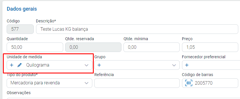 Primeiramente será necessário configurar o produto pesado, para isso é necessário cadastrar um código de barras para este produto pesado, portanto localize o mesmo no estoque e altere a unidade de medida para "Quilograma".