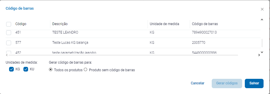 Poderá selecionar se quer gerar para todos os produtos ou somente os produtos sem código de barras, após isso clique em Gerar códigos e então em Salvar.