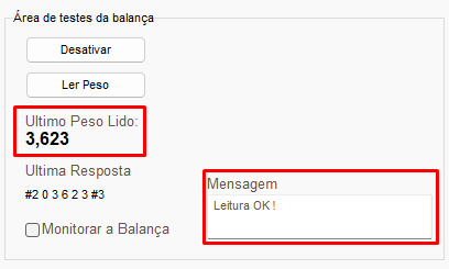 Após efetuar o preenchimento, poderá fazer os testes de leitura do peso e comunicação da balança, portanto na Área de testes da balança, clique em ativar e assim que tiver peso na balança clique em Ler Peso, será apresentado o peso lido e uma mensagem com Leitura OK!
