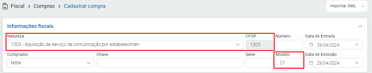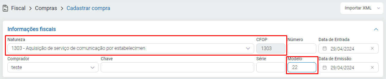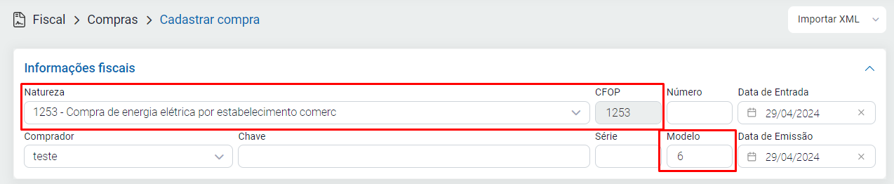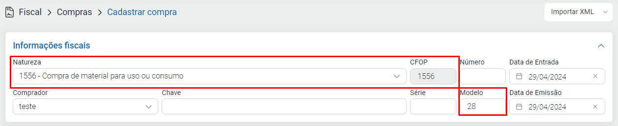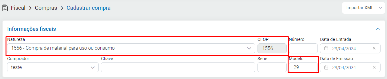 Para criar a nota, acesse o módulo Fiscal - Compras - clique em Cadastrar / defina o número e a série da mesma / após informe o modelo conforme sua necessidade e conforme especificado acima. Informe também a natureza de operação desejada com base nas informações fornecidas pelo contador da empresa.