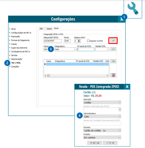 Após atualizar o sistema e instalar o ZPOS, acesse seu emissor de NFCe/Cheff/VendaGerencial ou ClippMEI, clique em Configurações (F10) - TEF/POS - Aba ZPOS.