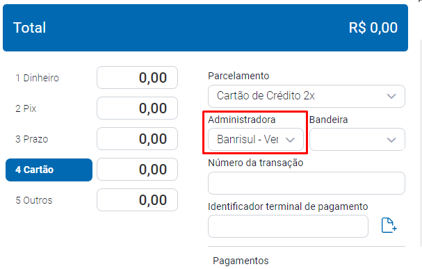 Depois das devidas configurações serem realizadas, Vá na aba Fiscal - NFCe - PDV/Cadastrar ou Gerencial, faça uma venda, seleione a forma de pagamento Cartão, e marque como Administradora Barisul - Vero Up