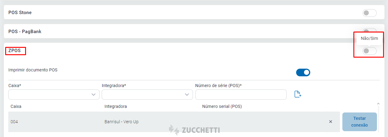 Desça até a aba ZPOS, marque para usar o ZPOS e preencha com os dados do Caixa em que será utilizado, a integradora Banrisul - Vero Up, e o Número de série (POS) é o serial que aparece no aplicativo da máquina. Em seguida, pressione no ícone e Teste a comunicação.